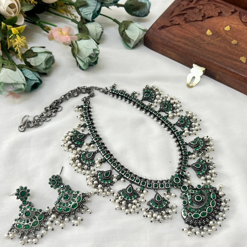 Green Enamel Oxidised Pearl Necklace Set | Silver Jewelry - Elegantlike.com | |