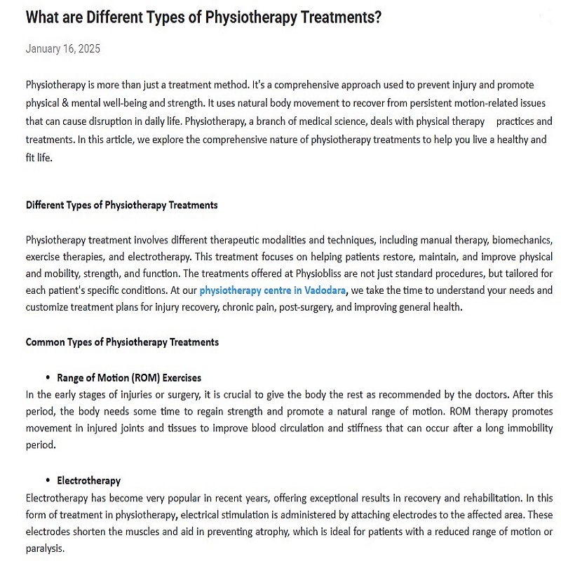In this article, we explore the comprehensive nature of physiotherapy treatments to help you live a healthy and fit life. At our physiotherapy centre in Vadodara, we provides Different Types of Physiotherapy Treatments like, Range of Motion Exercises, Electrotherapy, Dry Needling, etc. Call us! ![]() | |