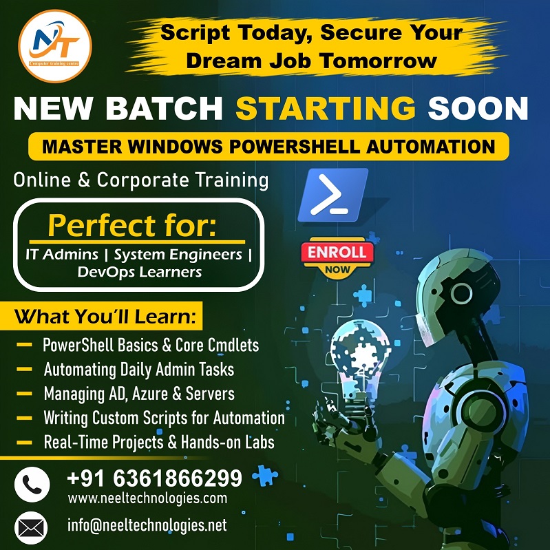 Boost your IT career with our PowerShell Training & Certification Program designed for beginners and professionals. Learn cmdlets, advanced scripting, automation, remote sessions, WMI/CIM, and Azure PowerShell modules. Our expert-led classes include live sessions, hands-on labs, and real-time practice. Perfect for IT support, system admins, and cloud engineers looking to upgrade automation skills. Get flexible batch timings, weekend classes, and complete study materials. For more Call Us: +91 6361866299 Mail Us: info@neeltechnologies.net Address: Doddabele Kengeri Bangalore - 560040 Visit Us: https://neeltechnologies.com/ ![]() | |