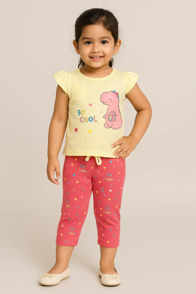 Girls Yellow Dino Tee & Pink Printed Pajama Set | |