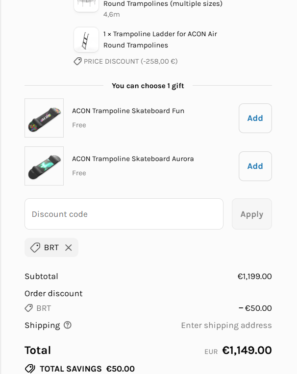 Use code BRT at checkout to save $15–$100 on ACON trampolines and accessories. ![]() | |