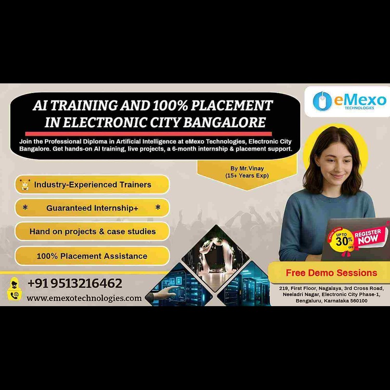 Description: eMexo Technologies is a leading AI Training Institute in Electronic City Bangalore, offering hands-on and industry-focused Artificial Intelligence training. Our AI Course in Electronic City Bangalore covers essential AI concepts including Machine Learning, Deep Learning, Neural Networks, Natural Language Processing (NLP), and Generative AI. We provide flexible classroom and online training options, real-world project experience, and expert mentorship from industry professionals. Recognized as one of the Best AI Training in Electronic City Bangalore, we also offer 100% placement assistance through our AI Training and Placement in Electronic City Bangalore. If you're looking for a trusted AI Training Center in Electronic City Bangalore, eMexo Technologies is your ideal destination. Courses Offered: AI Certification Course in Electronic City Bangalore Machine Learning & Deep Learning Generative AI & NLP Real-Time Project Training Placement Assistance Mode of Training: Classroom & Online ![]() | |