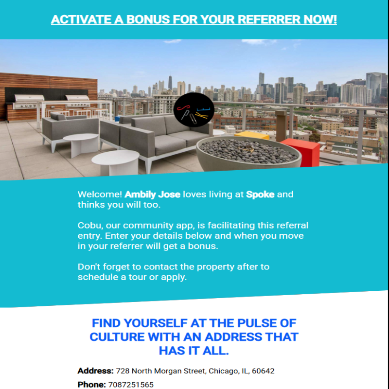 I love living at Spoke, I’m referring you to live here too for a discount! If you are interested, please take 1 minute to fill out this referral form to get started on Cobu. ![]() | |