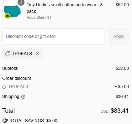 Use coupon code: TPDEALS and get $5 off your order from Tiny Undies. ![]() | |
