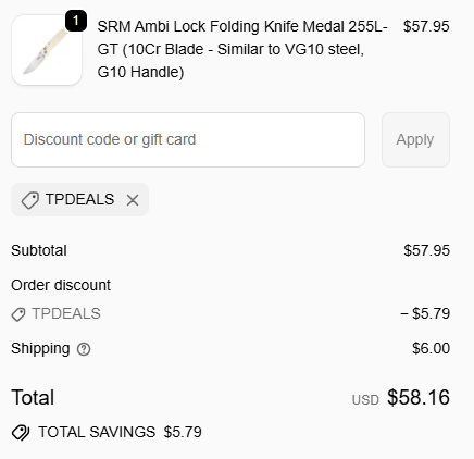 Use coupon code: TPDEALS and get 10% off your order from SRM Knives. ![]() | |