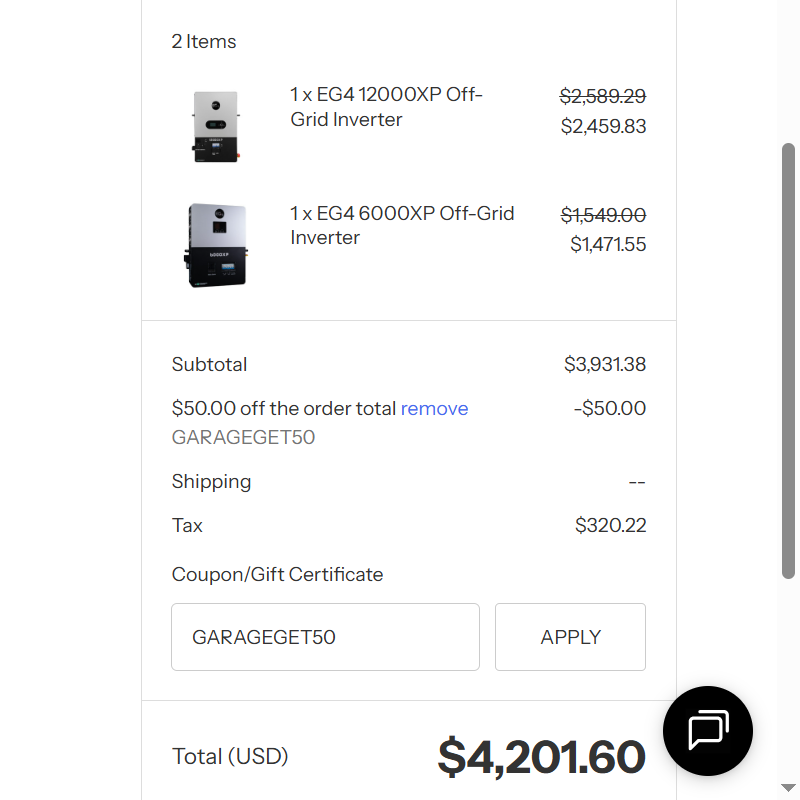 Use coupon code: GARAGEGET50 to save $50 off a purchase of $500 or more from Signature Solar. ![]() | |