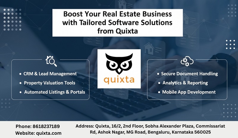 | Looking to streamline your real estate operations and enhance your digital presence? Quixta, a leading Real Estate Software Development Company, specializes in building custom real estate software solutions that empower agents, brokers, and property managers to scale efficiently. Our real estate software development services are designed to simplify property listings, automate workflows, manage clients, and drive measurable growth. With over 7+ years of expertise, Quixta has helped businesses across 27+ countries achieve digital transformation through intelligent, user-centric, and performance-driven software. Whether you need a CRM for real estate, a property management platform, or a custom mobile app, Quixta combines creativity, strategy, and technology to deliver results that last. Address: Quixta, 16/2, 2nd Floor, Sobha Alexander Plaza, Commissariat Rd, Ashok Nagar, MG Road, Bengaluru, Karnataka 560025 Phone: 8618237189 Website: https://quixta.com  | |
